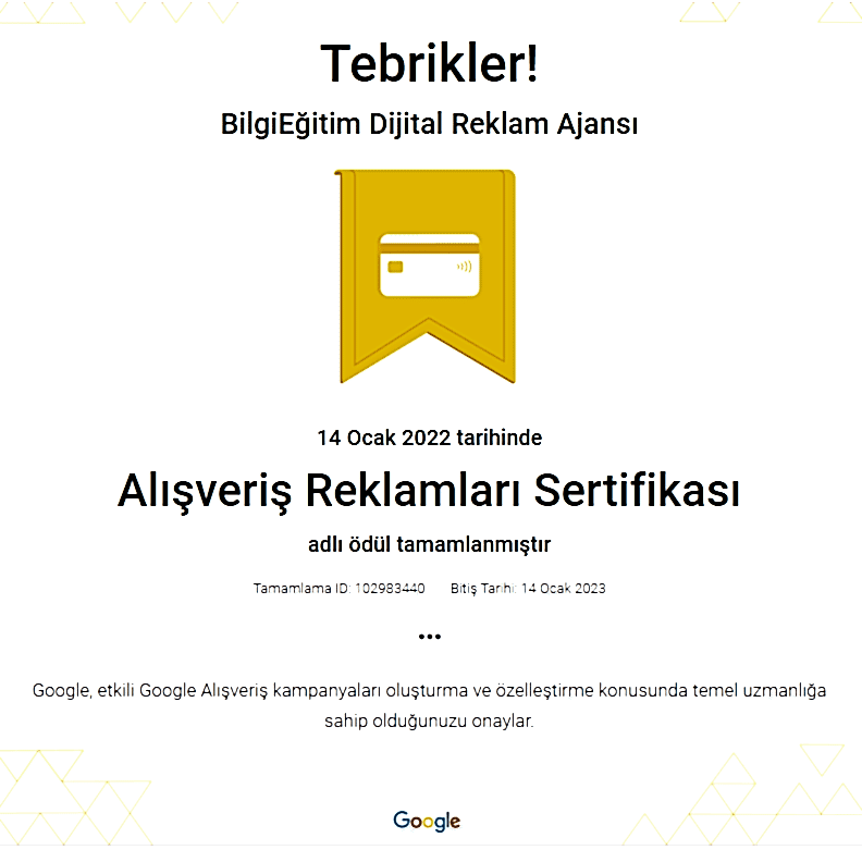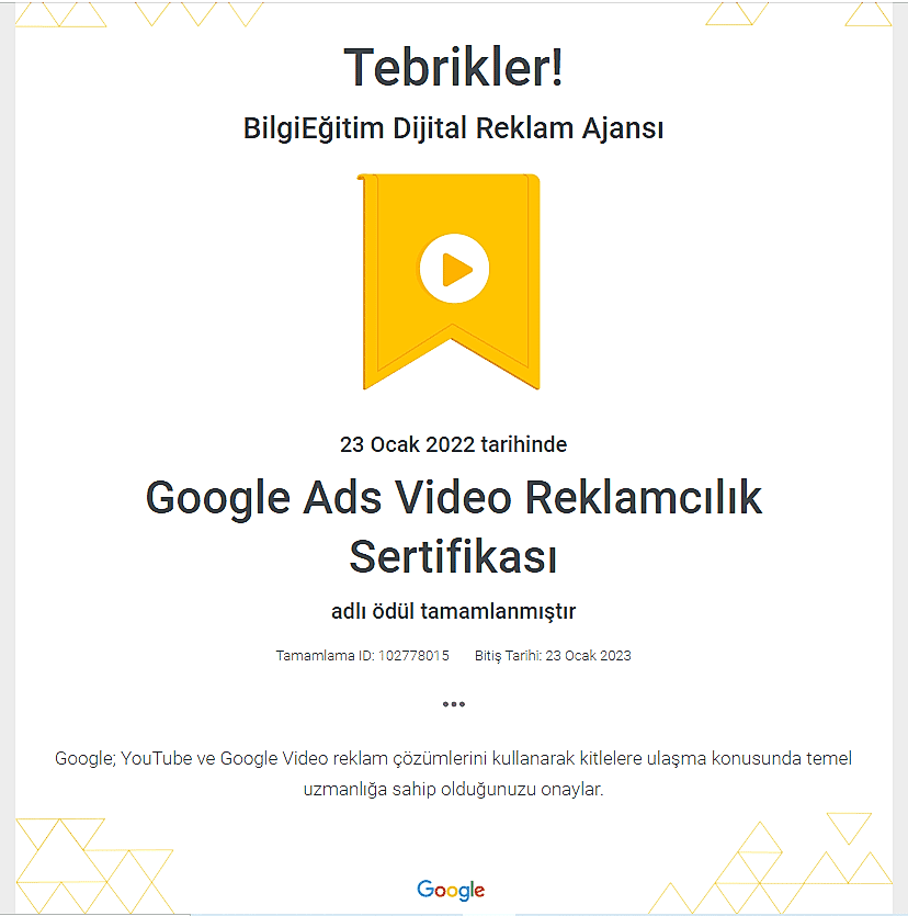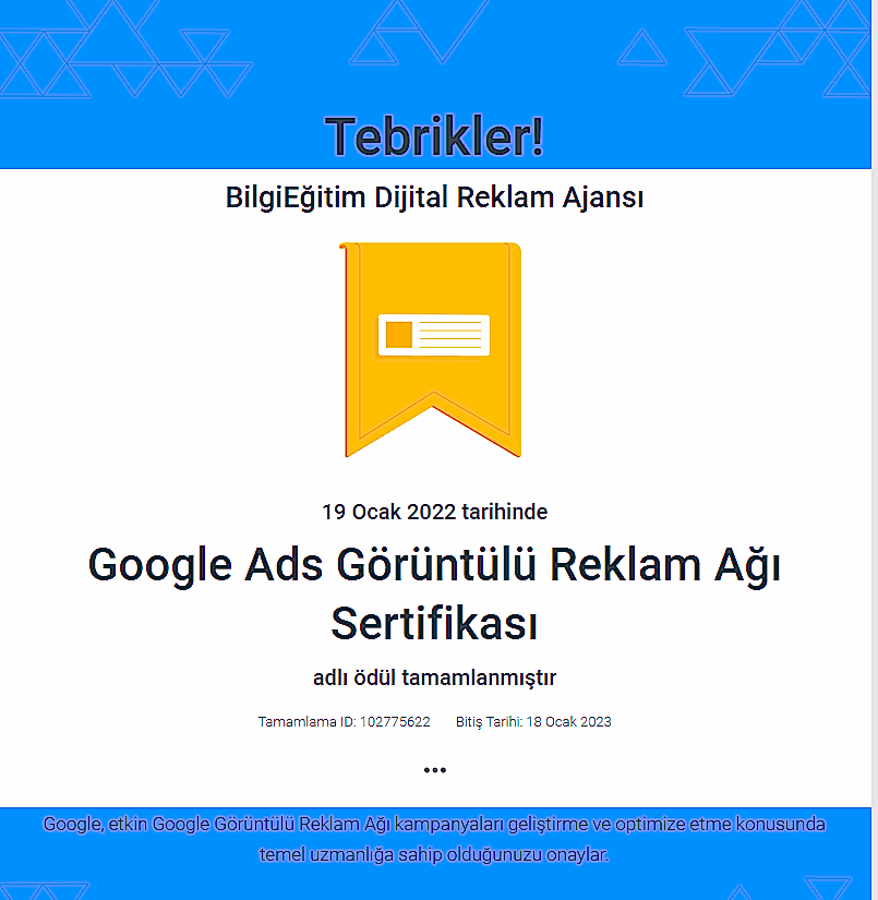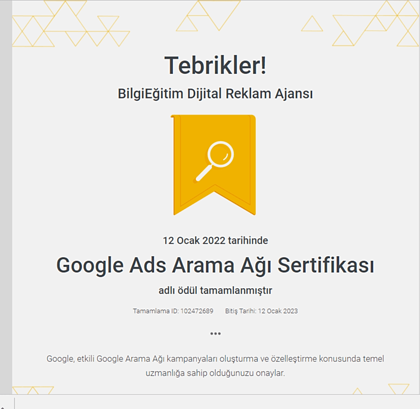 Google'ın reklamcılık platformu olan Ads'in temel ve ileri düzey özelliklerinde uzmanlığınızı gösteren ve bireylere Google tarafından verilen bir yetkinlik belgesidir. Bu sertifika, Google'ın ilgili kişiyi bir dijital reklamcılık uzmanı olarak onayladığını gösterir.